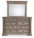 | Details | B916B5: Includes panel headboard, footboard with slats and rails, Made with hardwood solids, oak and ash veneer, cast resin components and engineered wood substrates, Tops with inlaid ash veneer border, Light warm grayish brown glazed wood finish, Breakfront pilasters, Inset picture frame panels, Headboard features light bridge with 2 overhead LED lights, Foundation/box spring required, sold separately , Mattress available, sold separately, Assembly required, B916B1: Includes dresser and mirror, Made with hardwood solids, oak and ash veneer, cast resin components and engineered wood substrates, Tops with inlaid ash veneer border, Light warm grayish brown glazed wood finish, Round metal knobs with satin nickel-tone finish, 10 drawers with fully finished interior, dovetail construction and ball-bearing side glides, Drawers with inset framed fronts, Dresser with breakfront pilasters, Mirror frame features light bridge with 2 mini LED lights, Mirror attaches to back of dresser, B916-46: Made with hardwood solids, oak and ash veneer, cast resin components and engineered wood substrates, Top with inlaid ash veneer border, Light warm grayish brown glazed wood finish, Round metal knobs with satin nickel-tone finish, 5 drawers with fully finished interior, dovetail construction and ball-bearing side glides, Drawers with inset framed fronts, Breakfront pilasters, | |