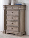 Details B916B4: Includes panel headboard, footboard with slats and rails, Made with hardwood solids, oak and ash veneer, cast resin components and engineered wood substrates, Tops with inlaid ash veneer border, Light warm grayish brown glazed wood finish, Breakfront pilasters, Inset picture frame panels, Headboard features light bridge with 2 overhead LED lights, Foundation/box spring required, sold separately , Mattress available, sold separately, Assembly required, B916B1: Includes dresser and mirror, Made with hardwood solids, oak and ash veneer, cast resin components and engineered wood substrates, Tops with inlaid ash veneer border, Light warm grayish brown glazed wood finish, Round metal knobs with satin nickel-tone finish, 10 drawers with fully finished interior, dovetail construction and ball-bearing side glides, Drawers with inset framed fronts, Dresser with breakfront pilasters, Mirror frame features light bridge with 2 mini LED lights, Mirror attaches to back of dresser, B916-46: Made with hardwood solids, oak and ash veneer, cast resin components and engineered wood substrates, Top with inlaid ash veneer border, Light warm grayish brown glazed wood finish, Round metal knobs with satin nickel-tone finish, 5 drawers with fully finished interior, dovetail construction and ball-bearing side glides, Drawers with inset framed fronts, Breakfront pilasters,