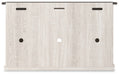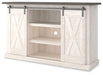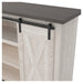 | Details | Made of engineered wood and decorative laminate, Antique white finish, Top with replicated gray wood grain, Metal brackets and hardware, Pair of sliding barn doors, 2 adjustable center shelves; 4 side shelves, Cross-buck details, Cutouts for wire management, Assembly required | |