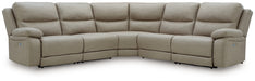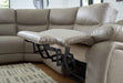 Experience ultimate comfort with this power reclining sectional. Generously cushioned with plush bustle back styling and pillow top track arms, it's wrapped in a richly neutral upholstery that’s oh-so soft. Jumbo stitching gives the sectional added definition. A one-touch power control and USB charging take the pleasure of reclining to a higher level.