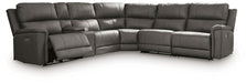 Details | Includes 6 pieces: left-arm facing power recliner, armless chair, power armless recliner, console with storage, wedge and right-arm facing power recliner, One-touch power control with adjustable positions, Easy View™ adjustable headrest and zero-draw USB-A and USB-C ports, Zero-draw technology only consumes power when the USB receptacle is in use, Zero-gravity mechanism allows optimum reclining comfort with infinite reclining positions at the touch of a button, Corner-blocked frame with metal reinforced seat; attached back and seat cushions, High-quality foam cushions wrapped in poly fiber, 100% top grain leather covers inside areas such as the back, seat and arm cushions; skillfully matched faux leather covers the remaining areas, Due to its natural origin, real leather can show individual characteristics such as healed scars, growth marks, grain variation and shade variation, Natural variations make each hide unique and do not detract from the wearing qualities of leather, Console with 2 cup holders and hidden storage, Zero wall recliner design requires minimal space between wall and chair back, Zero gap mechanism maintains consistent lower back and lumbar support throughout every stage of reclining for the ultimate relaxation experience, Power cord included; UL Listed | |