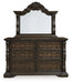 Details | B947B5: Includes upholstered panel headboard, upholstered panel footboard and panel rails, Made with hardwood solids, oak and ash swirl veneers, MDF substrates and cast resin components, Dark brown finish, Polyester upholstery with button tufting, Foundation/box spring required, sold separately, Mattress available, sold separately, Assembly required, B947B1: Includes dresser and mirror, Made with hardwood solids, oak and ash swirl veneers, MDF substrates and cast resin components, Dark brown finish, 6 smooth-gliding drawers with dovetail construction (top drawer felt lined), Drawer pulls with antiqued goldtone finish, Mirror attaches to back of dresser, B947-46: Made with hardwood solids, oak and ash swirl veneers, MDF substrates and cast resin components, Dark brown finish, 5 smooth-gliding drawers with dovetail construction (top drawer felt lined), Drawer pulls with antiqued goldtone finish, B947-93: Made with hardwood solids, oak and ash swirl veneers, MDF substrates and cast resin components, Dark brown finish, 2 smooth-gliding drawers with dovetail construction (top drawer felt lined), Pull-out tray behind bottom drawer, Drawer pulls with antiqued goldtone finish, 110V power supply with dual USB charging ports, Power cord included; UL Listed, | |