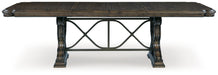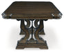 Details D947D5: Made with hardwood solids, oak and ash swirl veneers, MDF substrates and cast resin components, Dark brown finish, Double pedestal base, Removable center leaf, Table extends by pulling both ends and dropping in leaf, Shaped metal stretcher bar, Dining chairs sold separately, Seats up to 8, Assembly required, D947-01: Made with wood and cast resin, Dark brown finish, Foam cushioned seat with polyester upholstery, Ornate cabriole legs, Assembly required,