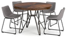 Details | D372-15: Tabletop made with mindi veneer and engineered wood, Metal base with brushed dark bronze-tone finish, Seats up to 4, Assembly required, D372-08: Tubular metal base, Bucket seat, Gray faux leather upholstery, Assembly required, | |