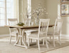 Details D683-35: Made with hardwood solids, select veneers and MDF substrates, Two-tone finish (antiqued white and light grayish brown wood tone), Double trestle base, Removable center leaf stores conveniently underneath the tabletop, Table extends by pulling both ends and dropping in leaf, Seats up to 8, Assembly required, D683-02: Made with solid wood frame, Antiqued white finish, Polyester upholstery, Next-Gen Nuvella™ is a performance fabric that is soft, easy to clean, stain-resistant and durable, Clean fabric with mild soap and water, let air dry; for stubborn stains, use a solution of 4 oz. bleach to 28 oz. water Foam cushioned seat, Legs with adjustable levelers, Assembly required,