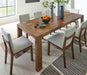 Details D496-01: Made with solid wood frame, Brown wood-tone finish, Foam seat and back cushions, Light beige polyester upholstery, Next-Gen Nuvella is a performance fabric that is soft, easy to clean, stain-resistant and durable, Clean fabric with mild soap and water, let air dry; for stubborn stains, use a solution of 4 oz. bleach to 28 oz. water, Assembly required, D496-25: Made with hardwood solids, butcher block mango wood veneer and MDF substrates, Brown wood-tone finish, Seats up to 8, Dining chairs sold separately, Assembly required,