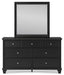 Details | B687B4: Includes full panel headboard, footboard and rails, Made with hardwood solids, birch veneer and MDF substrate, Black painted finish, Thick profiled tops, Tapered feet, Foundation/box spring required, sold separately, Mattress available, sold separately, Assembly required, Bed is compatible with an adjustable base, B687B1: Includes dresser and mirror, Made with hardwood solids, birch veneer and MDF substrate, Black painted finish, 7 smooth-gliding drawers with dovetail construction and ball-bearing side glides, Round metal drawer knobs with satin nickel-tone finish, Framed drawer fronts, Tapered feet, Mirror attaches to back of dresser, Assembly required, | |