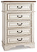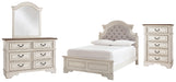 Details | B743-45: Made of veneers, wood and engineered wood, with cast resin components, Antiqued two-tone finish, 5 smooth-gliding drawers with dovetail construction (top drawer felt lined), Dark bronze-tone hardware, B743B12: Made of veneers, wood and engineered wood, with cast resin components, Antiqued two-tone finish, 6 smooth-gliding drawers with dovetail construction, Dark bronze-tone hardware, Mirror attaches to back of dresser, Assembly required, Includes tipover restraint device, B743B14: Made of veneers, wood and engineered wood, with cast resin components, Includes upholstered headboard, footboard and rails, Distressed, chipped white finish, Upholstered headboard with foam cushion, button tufting, Assembly required, Mattress and foundation/box spring available, sold separately, Bed is compatible with an adjustable base, | |