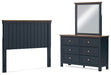 Details B414-87: Made with hardwood solids, mindi wood veneer and MDF substrates, Two-tone finish features a dark slate blue with a light brown wood-tone top, ¼" bolts (not included) are needed to attach headboard to your existing bed frame, Assembly required, B414B1: Includes dresser and mirror, Made with hardwood solids, mindi wood veneer and MDF substrates, Two-tone finish features a dark slate blue with light brown wood-tone top, Nickel-tone metal knobs, 6 drawers with fully finished interior, dovetail construction and heavy duty ball-bearing side glides, Mirror attaches to back of dresser,