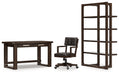 Details | H556-44: Made with hardwood solids, oak veneer and MDF substrates, Dark brown wood-tone finish, 2 smooth-gliding drawers, Cutout for cord management, Assembly required, H556-01A: Made with solid wood frame, Dark brown wood-tone finish, Foam cushioned seat and backrest with faux leather upholstery, Adjustable height, Casters for easy mobility, Assembly required, H556-70: Made with hardwood solids, oak veneer and MDF substrates, Dark brown wood-tone finish, 4 shelves, Assembly required, | |
