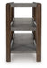 Details | Made with hardwood solids, oak veneer, MDF substrates and decorative melamine laminate, Dark burnished brown oak finish, Faux cement finish on top and shelf, 2 open display shelves | |