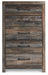 Details B211-46: Made of engineered wood (MDF/particleboard) and decorative laminate, Brown rustic finish with burnt orange and teal accents in a replicated wood grain with authentic touch, Large-scale hardware with dark finish, 5 smooth-gliding drawers, Drawer interiors are lined with a faux linen laminate for a clean, finished look, Includes tipover restraint device, Small Space Solution, Safety is a top priority, clothing storage units are designed to meet the most current standard for stability, ASTM F 2057 (ASTM International), Drawers extend out to accommodate maximum access to drawer interior while maintaining safety, B211B1: Made of engineered wood (MDF/particleboard) and decorative laminate, Brown rustic finish with burnt orange and teal accents in a replicated wood grain with authentic touch, 6 smooth-gliding drawers, Drawers lined with faux linen laminate, Dark-tone industrial hardware, Mirror attaches to back of dresser, Assembly required, Includes tipover restraint device, B211B52: Includes bookcase headboard, footboard, 2 underbed storage units, rails and wood roll slats, Made of engineered wood (MDF/particleboard) and decorative laminate, Brown rustic finish with burnt orange and teal accents in a replicated wood grain with authentic touch, Footboard with 4 drawers and 4 open cubbies that each accommodate 10.5"W x 10.5"D x 11"H cube storage bin (not provided), Headboard includes a dimming LED light; 3 open cubbies, Dark-tone industrial hardware, Bed does not require a foundation/box spring, Mattress available, sold separately, Assembly required,