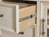 Details | B683B6: Includes panel headboard, footboard, rails and slats, Made with hardwood solids, veneers and MDF substrates, Two-tone finish (antiqued white and light gray wood tone), Foundation/box spring required, sold separately, Mattress available, sold separately, Assembly required, B683B1: Includes dresser and mirror, Made with hardwood solids, veneers and MDF substrates, Two-tone finish (antiqued white and light gray wood tone), Dark bronze-tone bar pulls, 2 glass-front cabinets, each with single storage shelf, 5 drawers with fully finished interior, dovetail construction and heavy duty ball-bearing side glides (top drawer felt lined), Mirror attaches to back of dresser, B683-92: Made with hardwood solids, veneers and MDF substrates, Two-tone finish (antiqued white and light gray wood tone), Dark bronze-tone bar pulls, 2 drawers with fully finished interior, dovetail construction and heavy duty ball-bearing side glides (top drawer felt lined), 110V power supply with USB-A and USB-C charging ports, Power cord included; UL Listed, | |