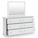 Details | B139B47: Includes panel headboard/footboard and rails, Made with engineered wood (MDF/particleboard/plywood) and decorative laminate for the right balance of affordability and durability, Replicated solid white paint, Decorative laminate replicates natural or man-made material surfaces with consistent color, pattern and texture, Foundation/box spring required, sold separately, Mattress available, sold separately, Assembly required, B139B40: Includes dresser and mirror, Made of engineered wood (MDF/particleboard), Knobs with pewter-tone finish, Scalloped moulding, 6 smooth-operating drawers, Includes tipover restraint device, Mirror attaches to back of dresser; can also be mounted on wall horizontally or vertically, Safety is a top priority, clothing storage units are designed to meet the most current standard for stability, ASTM F 2057 (ASTM International), Drawers extend out to accommodate maximum access to drawer interior while maintaining safety, B139-46: Made of engineered wood (MDF/particleboard), Pewter-tone knobs, Scalloped moulding, 5 smooth-operating drawers, Small Space Solution, Includes tipover restraint device, Safety is a top priority, clothing storage units are designed to meet the most current standard for stability, ASTM F 2057 (ASTM International), Drawers extend out to accommodate maximum access to drawer interior while maintaining safety, B139-91: Made of engineered wood (MDF/particleboard), Pewter-tone knobs, 1 smooth-operating drawer, 1 storage cubby, Scalloped moulding, Small Space Solution, | |