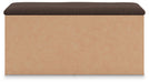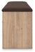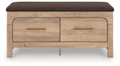 The natural wood tones and clean lines of this storage bench echo your easygoing style sensibilities. With a warm finish and replicated oak grain, its carefree character lightens up your bedroom. Curved inner corner details soften the look, while sleek bronze-tone hardware modernizes the feel. It’s a chic and functional addition to the foot of a bed.