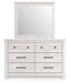 Looking to create a bedroom that feels airy and beautifully put together? This casually comfy dresser with mirror is your perfect solution. Its clean lines, whitewash finish and replicated pine grain exude a charming cottage-inspired feel that brightens your restful retreat. Spacious drawers with dark bronze-tone hardware stow away clothes and more. Now there’s a fresh take on country living we can get behind.