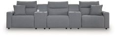 Details | Includes 5 modular pieces: left-arm facing power recliner, armless chair, 2 consoles, and right-arm facing power recliner, "Left-arm" and "right-arm" describe the position of the arm when you face the piece, Versatile modular pieces fit together in a variety of configurations, One-touch power control with adjustable positions, Easy View™ adjustable headrest and zero-draw USB port, Zero-draw technology only consumes power when the USB receptacle is in use, Corner-blocked frame with metal reinforced seat, Attached back and seat cushions; high-quality foam cushions wrapped in poly fiber, Polyester upholstery; Next-Gen Nuvella™ is a family-friendly fabric that is soft, easy to clean, stain-resistant and durable, Clean fabric with mild soap and water, let air dry; for stubborn stains, use a solution of 4 oz. bleach to 28 oz. water, Throw pillows with easy-to-remove zippered covers for machine washing; pillows with soft polyfill, Console with plexiglass top and 2 cup holders, Zero wall recliner design requires minimal space between wall and chair back, Power cord included; UL Listed | |