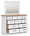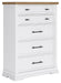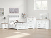 Details | B844B2: Includes panel headboard, storage footboard, rails and roll slats, Footboard made with hardwood solids, MDF substrates and butcher block oak veneer, Headboard and rails made with hardwood solids and MDF substrates, White finish, Headboard with inset black metal barn sash, 2 drawers in footboard with fully finished interior, dovetail construction and ball-bearing side glides, Pulls with matte black finish, Bed does not require a foundation/box spring, Mattress available, sold separately, Assembly required, B844B1: Includes dresser and mirror, Made with hardwood solids, MDF substrates and butcher block oak veneer, Dresser with 2-tone finish (white finish; butcher block oak veneer with natural finish), Pulls with matte black finish, 10 spacious drawers with fully finished interiors (top drawers felt lined), dovetail construction and ball-bearing side glides , Drawers with inset picture fronts, Mirror attaches to back of dresser, B844-46: Made with hardwood solids, MDF substrates and butcher block oak veneer, 2-tone finish (white finish; butcher block oak veneer with natural finish), Pulls with matte black finish, 5 spacious drawers with fully finished interiors (top drawers felt lined), dovetail construction and ball-bearing side glides, Drawers with inset picture frame fronts, | |