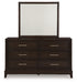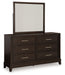Details | B618B2: Includes upholstered panel headboard, panel rails and panel footboard with slats, Made with hardwood solids, engineered wood and MDF substrates, Grayish brown wood-tone finish, Floating inset upholstered panel in polyester Next-Gen Nuvella fabric surrounded by LED backlight, Next-Gen Nuvella™ is a performance fabric that is soft, easy to clean, stain-resistant and durable, Clean fabric with mild soap and water, let air dry; for stubborn stains, use a solution of 4 oz. bleach to 28 oz. water, Light switch is located on each side of headboard and includes dual USB charging port (USB-A and USB-C), Power cord included; UL Listed, Foundation/box spring required, sold separately, Mattress available, sold separately, Assembly required, B618B1: Includes dresser and mirror, Made with hardwood solids, engineered wood and MDF substrates, Grayish brown wood-tone finish, Metal bar pulls with satin nickel-tone finish, 6 smooth-gliding drawers with dovetail construction and heavy duty ball-bearing side glides (top drawers felt lined), Mirror attaches to back of dresser, B618-92: Made with hardwood solids, engineered wood and MDF substrates, Grayish brown wood-tone finish, Metal bar pulls with satin nickel-tone finish, 2 smooth-gliding drawers with dovetail construction and heavy duty ball-bearing side glides (top drawers felt lined), | |