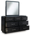 Details B821B2: Includes upholstered panel headboard, footboard and rails , Made with hardwood solids and ash veneer, Black finish on textured wood grain surface , Waterfall edges, Polyester upholstery, Foundation/box spring required, sold separately, Mattress available, sold separately, Assembly required, B821B1: Includes dresser and mirror, Made with hardwood solids and ash veneer, Black finish on textured wood grain surface , Burnished nickel-tone pulls, Waterfall edges, 7 smooth-gliding drawers with fully finished interior, dovetail construction and heavy duty ball-bearing side glides, Mirror attaches to back of dresser, B821-46: Made with hardwood solids and ash veneer, Black finish on textured wood grain surface, Burnished nickel-tone pulls, Waterfall edges, 5 smooth-gliding drawers with fully finished interior, dovetail construction and heavy duty ball-bearing side glides, B821-91: Made with hardwood solids and ash veneer, Black finish on textured wood grain surface, Brushed nickel-tone pulls, Waterfall edges, Smooth-gliding drawer with fully finished interior, dovetail construction and heavy duty ball-bearing side glides, Lower cubby shelf with built-in LED nightlight, 110V power supply with USB-A and USB-C charging ports, Power cord included; UL Listed,