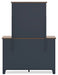 Details | B414B2: Includes panel headboard, footboard, rails and slats, Made with hardwood solids, mindi wood veneer and MDF substrates, Two-tone finish features a dark slate blue with a light brown wood-tone top, Foundation/box spring required, sold separately, Mattress available, sold separately, Assembly required, B414B1: Includes dresser and mirror, Made with hardwood solids, mindi wood veneer and MDF substrates, Two-tone finish features a dark slate blue with light brown wood-tone top, Nickel-tone metal knobs, 6 drawers with fully finished interior, dovetail construction and heavy duty ball-bearing side glides, Mirror attaches to back of dresser, | |