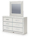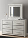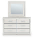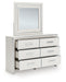 Details | Includes dresser and mirror, Made with engineered wood (MDF/particleboard/plywood) and decorative laminate for the right balance of affordability and durability, Matte white finish with subtle replicated wood grain, Decorative laminate replicates natural or man-made material surfaces with consistent color, pattern and texture , Chrome-tone accents, Large-scale chrome-tone handles with faceted details, 6 smooth-gliding drawers, Drawer interiors are lined with a faux linen laminate for a clean, finished look, Mirror attaches to back of dresser; can also be mounted on wall horizontally or vertically, Safety is a top priority, clothing storage units are designed to meet the most current standard for stability, ASTM F 2057 (ASTM International), Drawers extend out to accommodate maximum access to drawer interior while maintaining safety, Minor assembly required | |